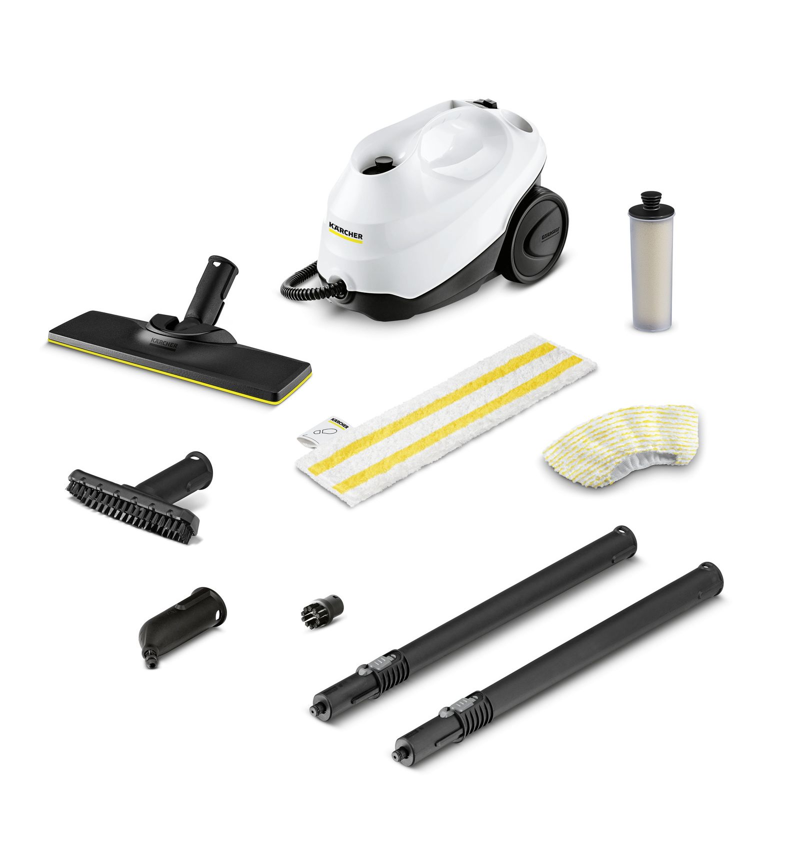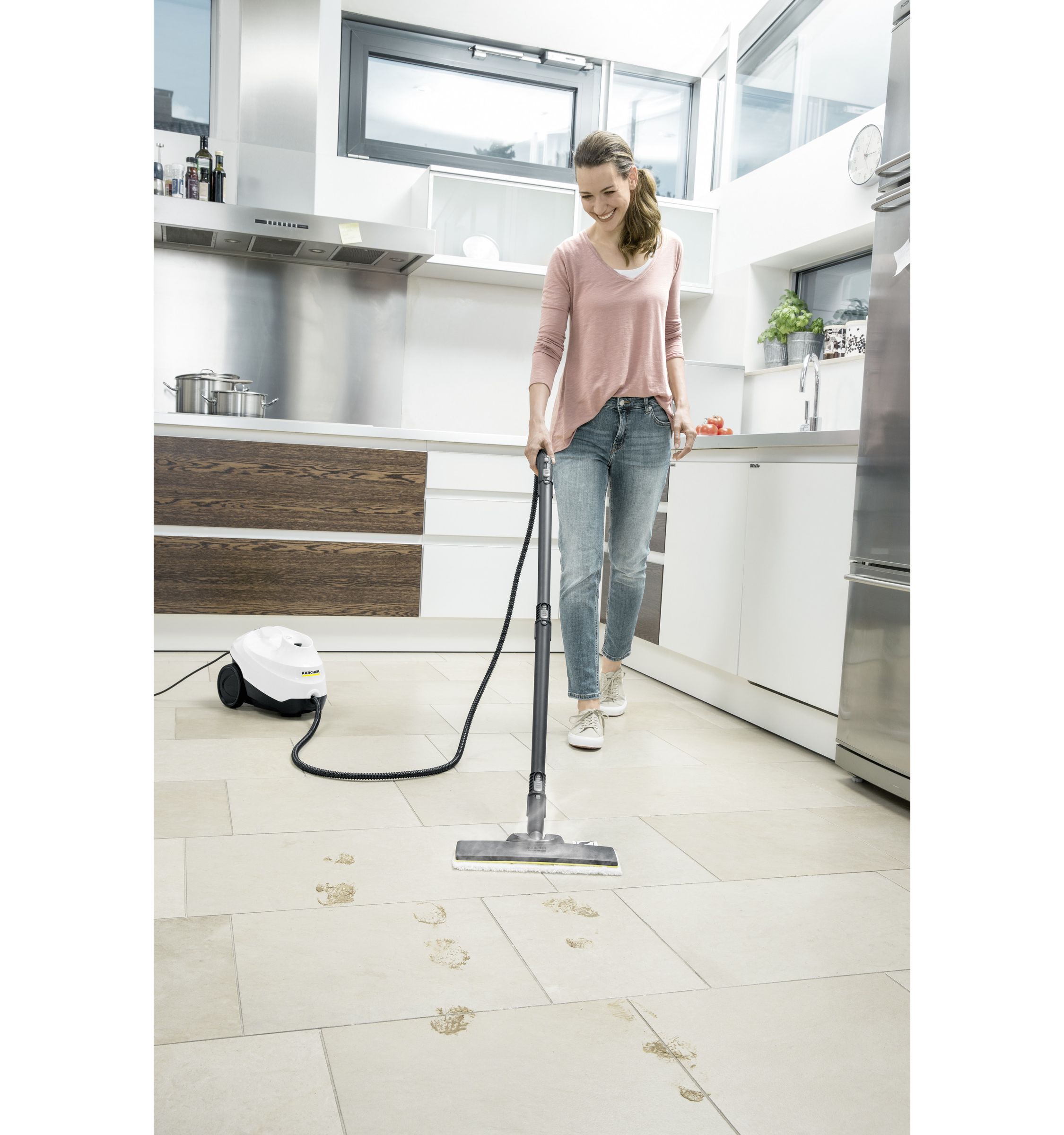 Testele au arătat că, prin curățare punctuală de 30 de secunde la nivelul maxim de abur și prin contact direct cu suprafața de curățare cu aparatul de curățare cu aburi Kärcher, 99,999% dintre virusurile învelite, cum ar fi coronavirusul sau gripa (cu excepția virusului hepatitei B) pot fi eliminate de pe suprafețele dure netede obișnuite din gospodărie (test: Modified-Vaccinia-Ankara-Virus). La curățarea în profunzime cu aparatul de curățare cu aburi Kärcher, 99,99% din toate bacteriile obișnuite de uz casnic vor fi eliminate pe suprafețele dure netede obișnuite de uz casnic, cu condiția vitezei de curățare de 30 cm/s la nivelul maxim de abur și a contactului direct cu suprafața de curățare (test: Enterococcus hirae). / ³⁾ Factorul minim prin care se prelungește durata de viață a produsului, bazat pe teste interne cu duritatea apei de 20 °dH și duritatea carbonatului de 15 °dH.