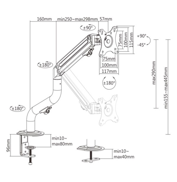 Arm for 1 monitor 17"-32" - Gembird MA-DA1-02, Adjustable desk display mounting arm, Gas spring 2-8kg, VESA 75/100, arm rotates, extends and retracts, tilts to change reading angles, and allows to rotate display from landscape-to-portrait mode
