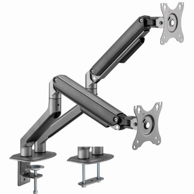 Arm for 2 monitors 17”-32” - Gembird MA-DA2-05, Steel (1.35 mm), Gas spring 2-9 kg per display, VESA 75/100, arm rotates, extends and retracts, tilts to change reading angles, and allows to rotate display from landscape-to-portrait mode, space grey