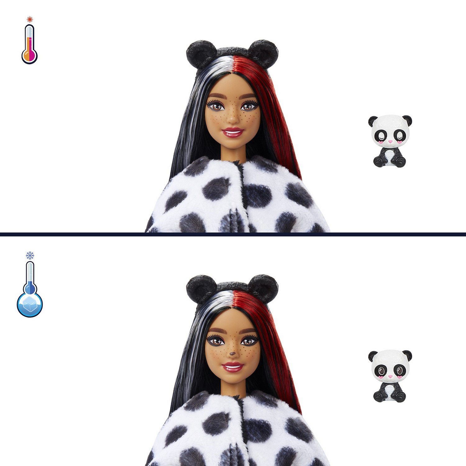 Извлеките из пакетов мерцающую юбку, аксессуары, губку-расческу и маленькую фигурку питомца. Верхнюю часть костюма можно вывернуть и получить мягкую куртку для куклы, а его голова превращается в лежанку для панды! Далее намочите губку-расческу в холодной воде и проведите по лицу Барби и мордочке питомца. На лице куклы проявится раскраска панды, а питомец закроет глазки. Для обратного превращения используйте теплую воду.