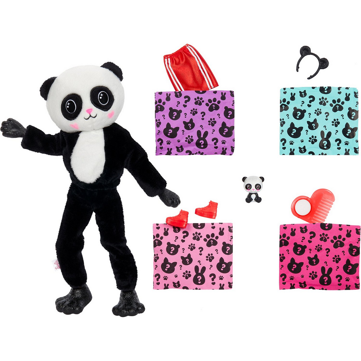 - 1 кукла в костюме панды из 5 предметов, 1 фигурка питомца, 4 аксессуара.