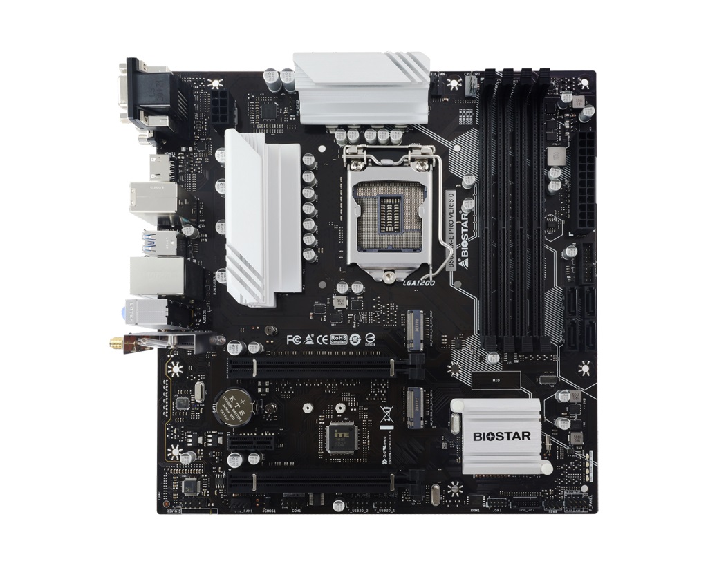 BIOSTAR B560MX-E PRO, Socket 1200, Intel(R) B560 (11/10th Gen CPU), Dual 4xDDR4-4000+, CPU Intel graphics, VGA, DVI, HDMI, 2xPCIe X16 4.0, 4xSATA3, 2xM.2 4.0, 1xM.2 E-key (for WiFi), 1xPCIe X1, ALC897 HDA, 1GbE LAN, 6xUSB 3.2, mATX