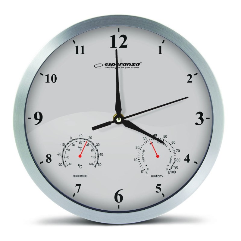 Clock Wall Esperanza LYON EHC016W WHITE, 25 cm, plastic frame, Quiet movement, hook for easy installation, Measurements: temperature and humidity, P