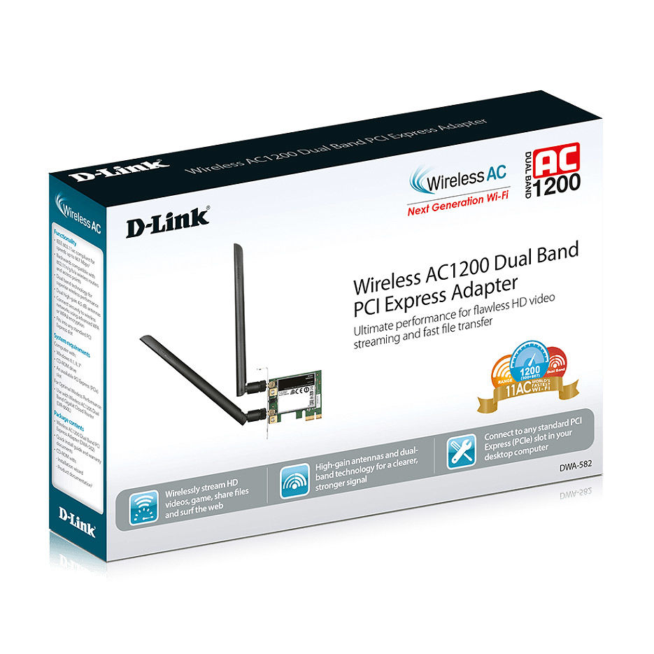 D-Link DWA-582/RU/B1A Wireless AC1200 Dual-band PCI Express Adapter, 802.11a/b/g/n and 802.11ac, switchable Dual band 2.4 GHz or 5 GHz. Up to 867 Mbps data transfer rate in 802.11ac mode