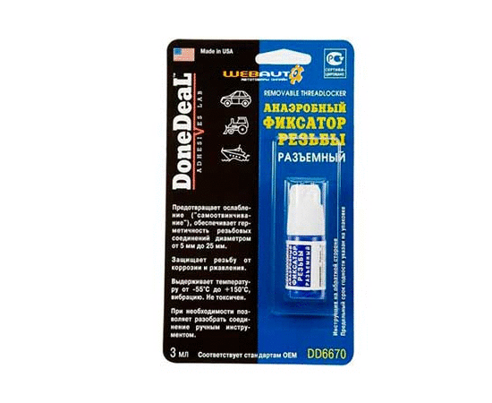 DD6670 рекомендуется применять во всех случаях, когда резьбовое соединение не должно ослабляться под действием напряжений, ударных нагрузок, вибраций, но может быть демонтировано при помощи ручного инструмента.Анаэробный фиксатор для герметичности резьбовых соединений от 5мм до 25 мм.ХарактеристикиСостав - метакриловые эфиры.Цвет - прозрачный.Термоустойчивость - от -55 °С до +150 °С .Вязкость, сПз - 600.Заполнение зазора - 0,18мм.Прочность на срез - 140 кг/см2 .Диаметр восст.резьбы - 5…25мм.Разборка соединения - ручным инструментом.Время схватывания - 15 мин.Время отвердевания - 60 мин.Полная полимеризация - 24 ч.Область примененияDD6673 используются для фиксации резьбовых, штифтовых и болтовых соединений:штифтов коромысел,регулировочных болтов,болтов клапанных крышек,масляного поддона,неподвижных тормозных скоб,деталей впускной системы,генератора, посадочных мест шкивов и пр.Особенности и преимуществазаполняя зазор, DD6670 способствует более равномерному распределению нагрузки;фиксирует и герметизирует соединение;предохраняет восстановленные соединения от влаги и коррозии;предотвращает ослабление и самоотвинчивание соединений.ПрименениеОчистить от смазки и просушить поверхности.Хорошо встряхнуть флакон, снять крышку и нанести каплю состава на поверхность резьбы.Произвести затяжку (с требуемым моментом) резьбового соединения.Детали могут быть нагружены немедленно после соединения.