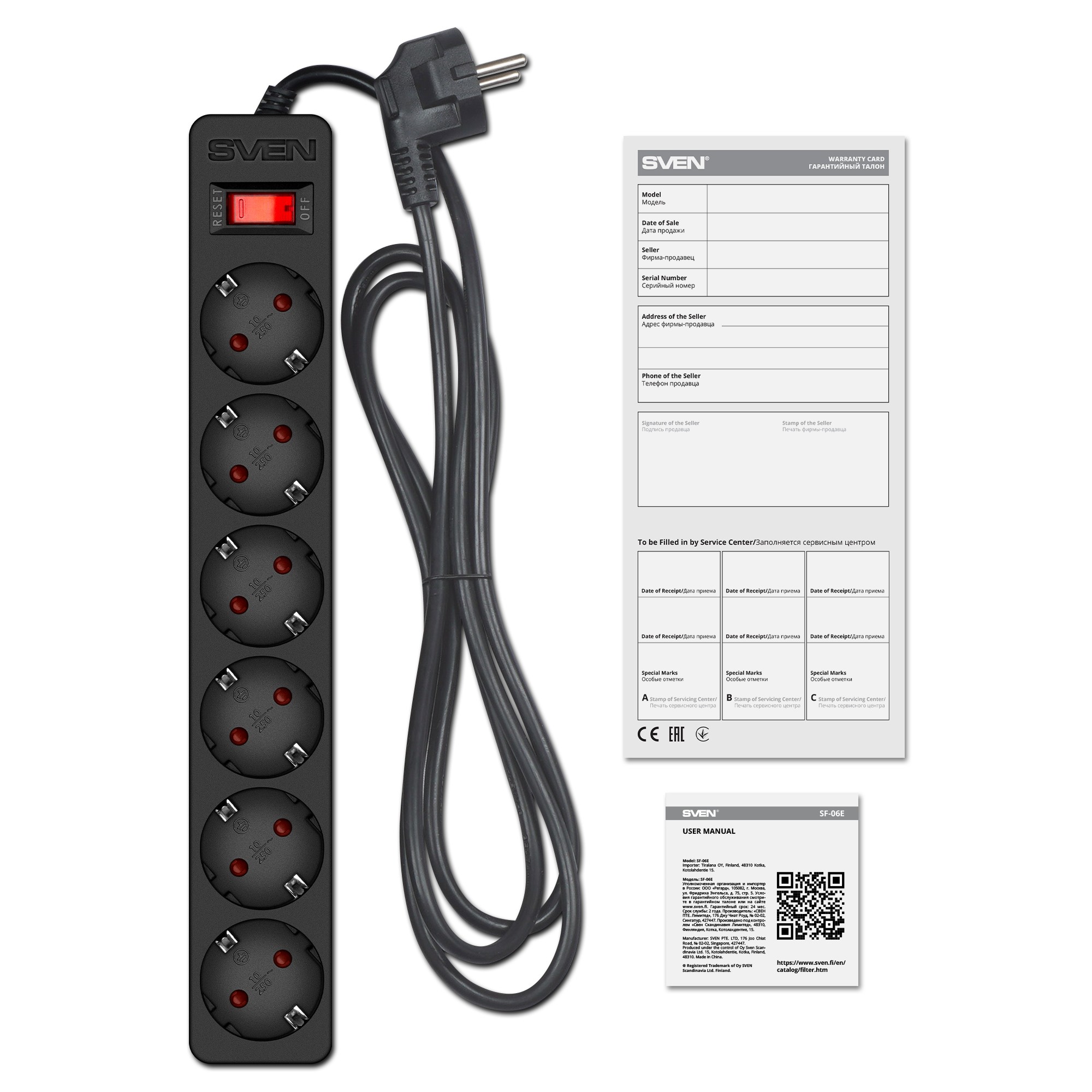 Фильтр сетевой SVEN SF-06E/ 6 Sockets/ 2300W/ 5.0m/ Black