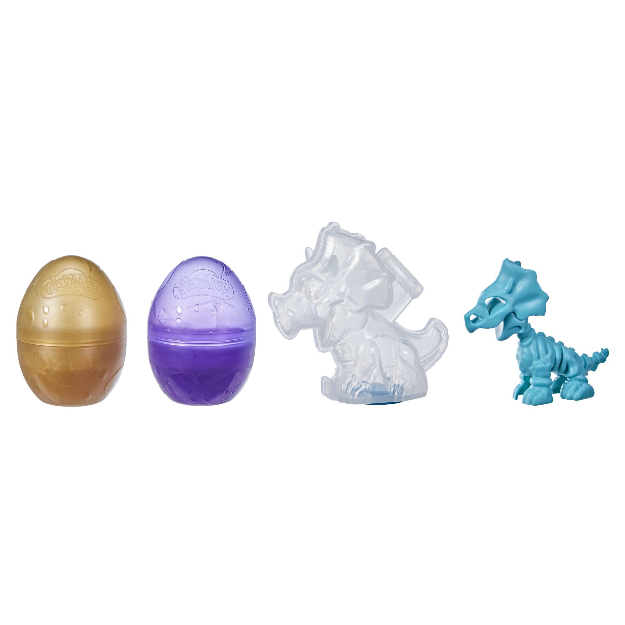 - «Вылупите» эти игрушечные яйца динозавра, чтобы обнаружить скелет динозавра и скользко-гладкий состав Play-Doh Slime HydroGlitz (синий и зеленый).