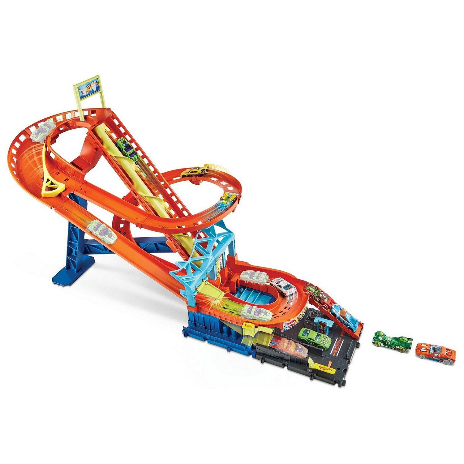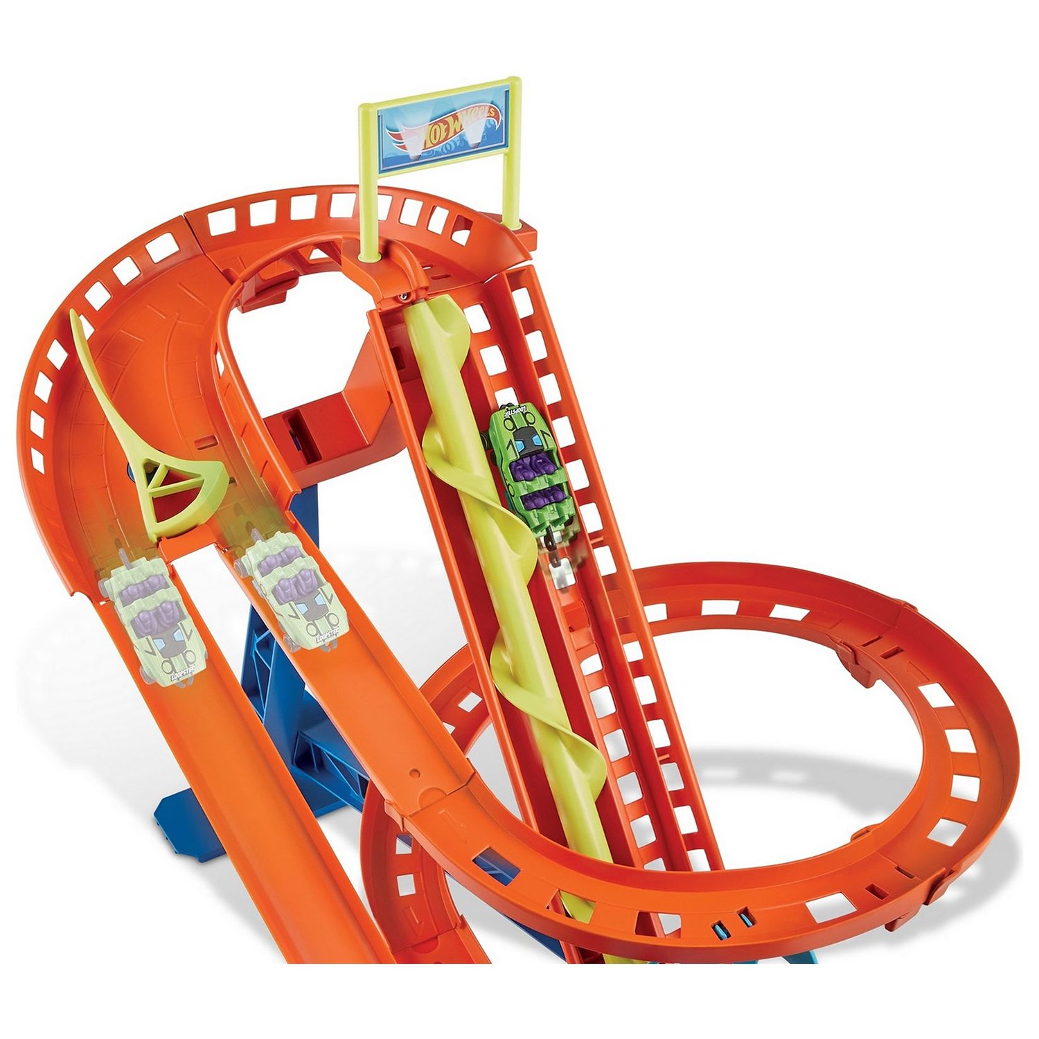 - Моторизованная спираль обеспечивает безостановочную гонку, позволяя детям получить новый опыт игры с трассами Хот Вилс