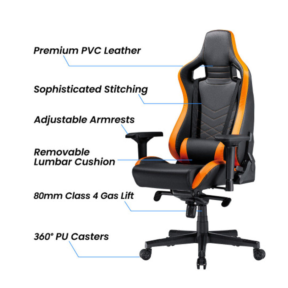 Игровое кресло Lumi Premium Gaming Chair CH06-34 with Headrest & Lumbar Support CH06-34, Black/Orange, PVC Leather, 4D Armrest, Steel Frame, 350mm Nylon Plastic Base, PU Caster, 80mm Class 4 Gas Lift, Weight Capacity 180 Kg