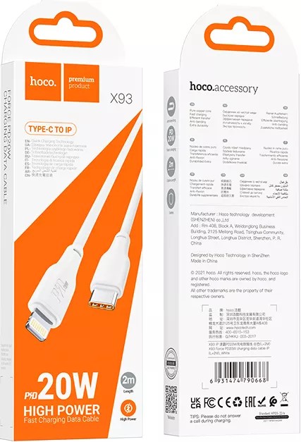 Кабель USB-C to Lightning HOCO “X93 Force” / 2m / Woven nylon / 20W / up to 3A / White