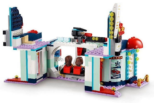 - Этот игровой набор оснащен петлями, и с одной стороны у него билетная кассе и красная дорожка, а с другой стороны открывается кинозал, туалет и киоск с попкорном. В набор входит Андреа из LEGO® Friends и еще две другие мини-куколки.