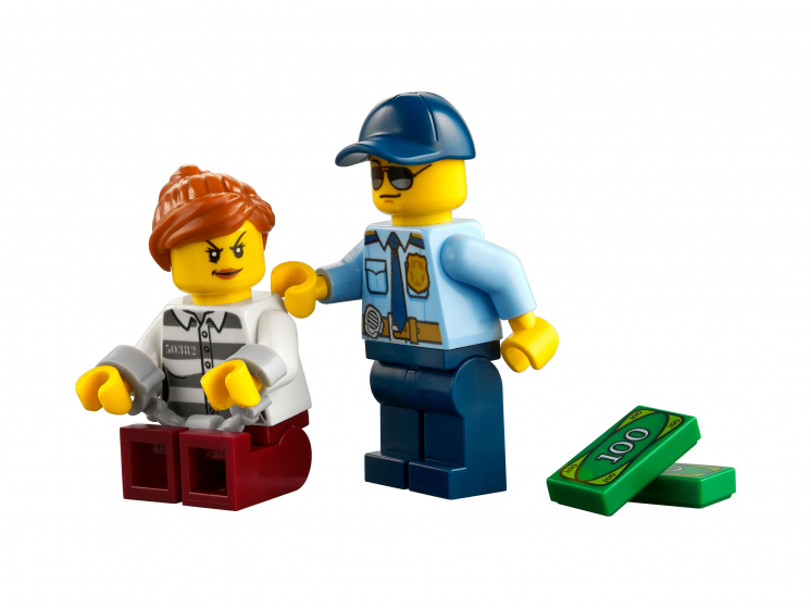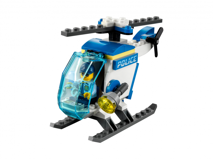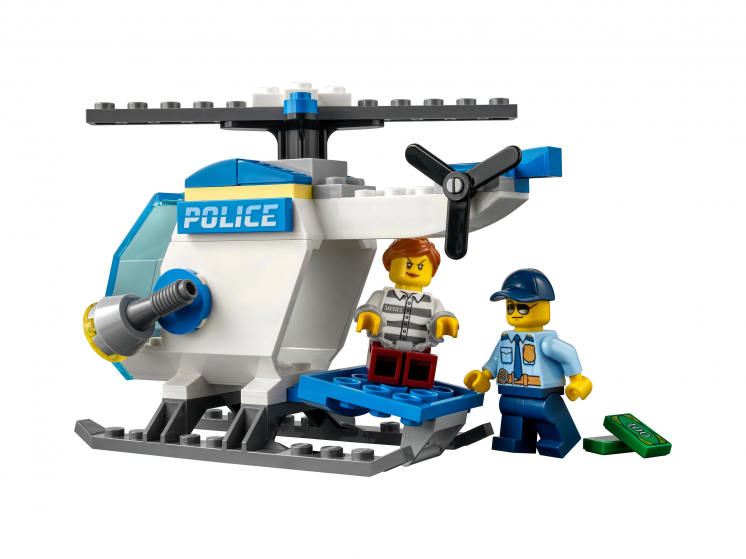 - У игрушечного полицейского вертолёта есть кабина для минифигурки, вращающиеся винты и фюзеляж, который открывается для пойманной воровки. Дети могут прикрепить воровку и краденые элементы с «деньгами» к скутеру.