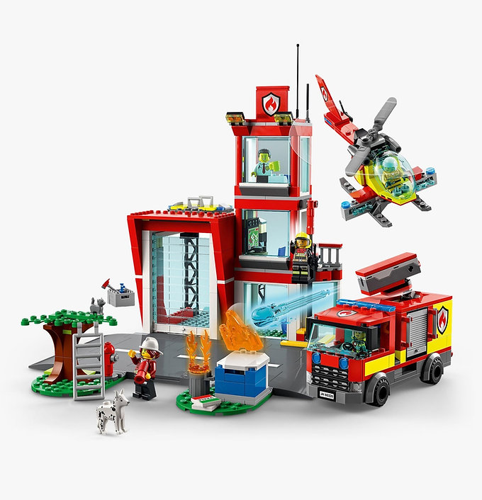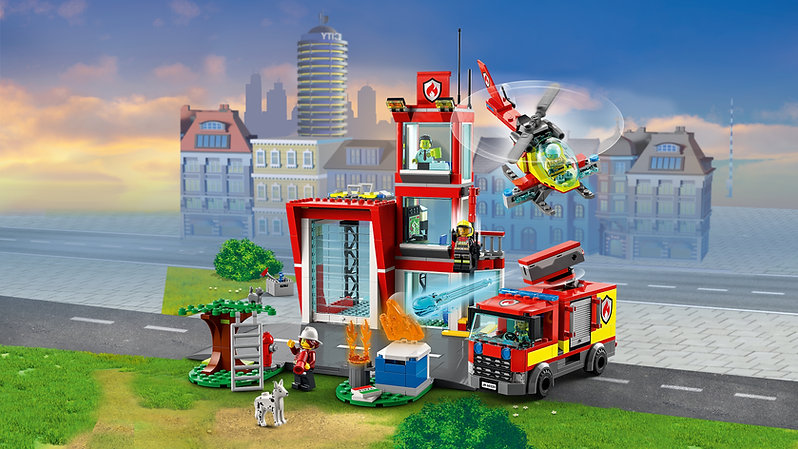 - Что в коробке? — все необходимое для сборки трехэтажной пожарной станции, грузовика и вертолета, пять минифигурок, фигурки собаки и кошки, а также дорожная плита LEGO® для объединения с другими игровыми наборами LEGO City.