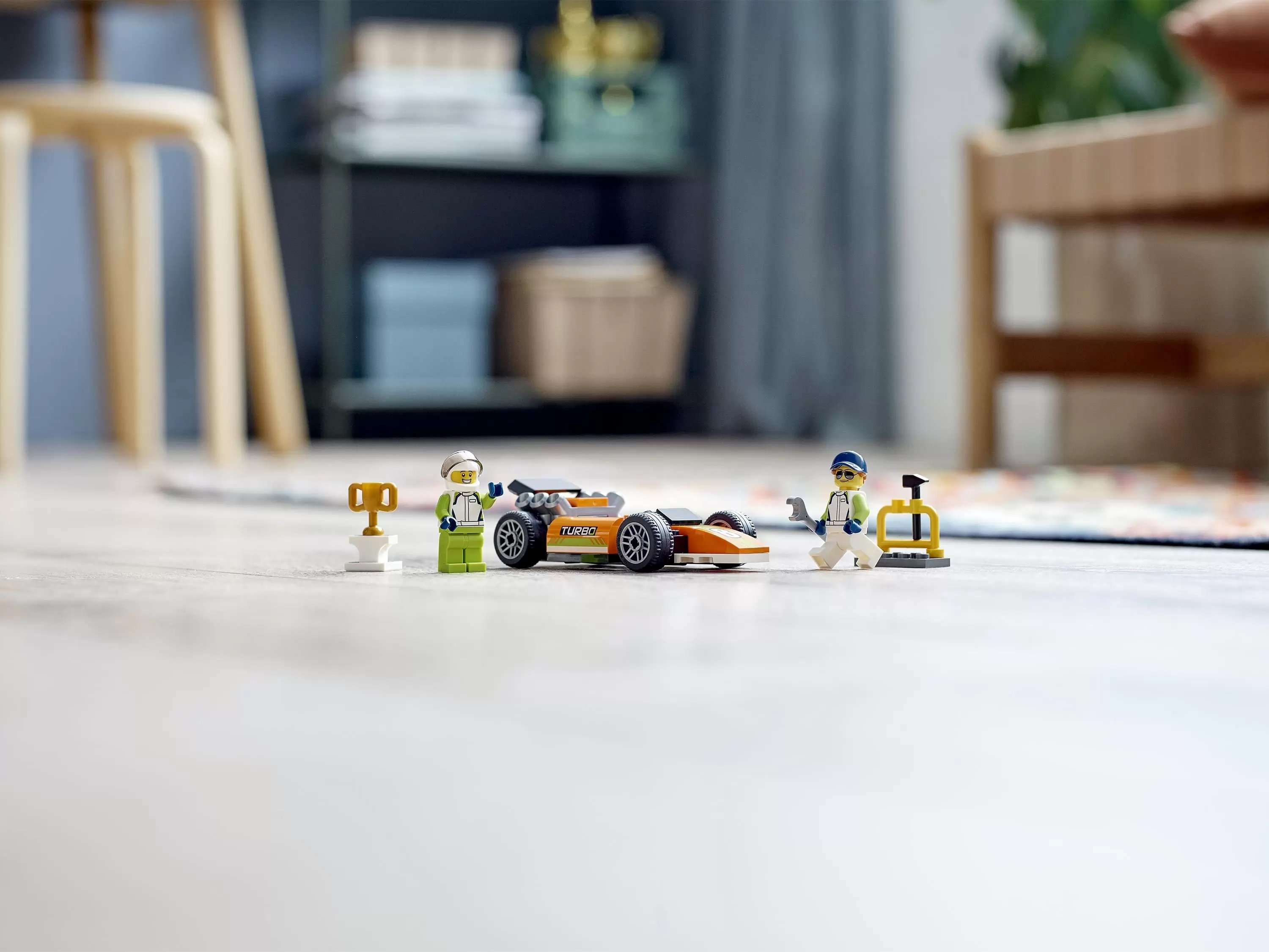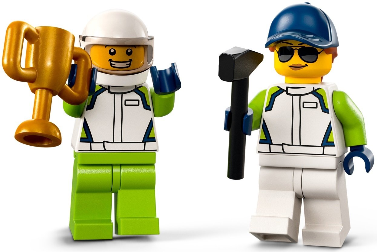 - Забавные аксессуары для минифигурок — в этот игровой набор с гоночным автомобилем входят игрушечный молоток, гаечный ключ, шлем и кубок победителя LEGO®, чтобы минифигурки могли участвовать в гонках и ремонтировать машину на пит-стопе.