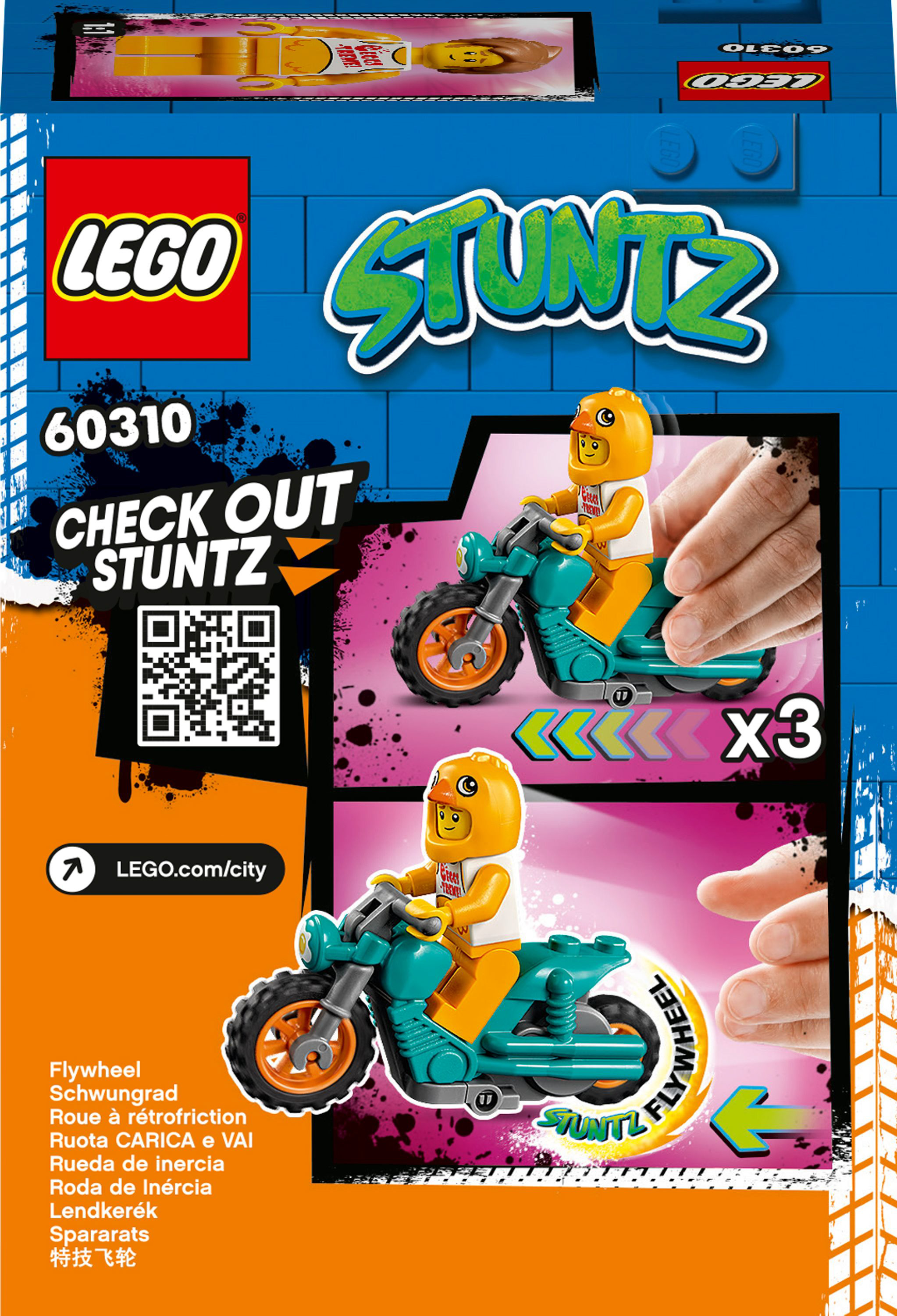 - В этом игровом наборе «Трюковый мотоцикл с цыплёнком» LEGO® City (60310) есть потрясающий мотоцикл с маховиком для выполнения головокружительных трюков, а также персонаж сериала «ЛЕГО Сити. Приключения».