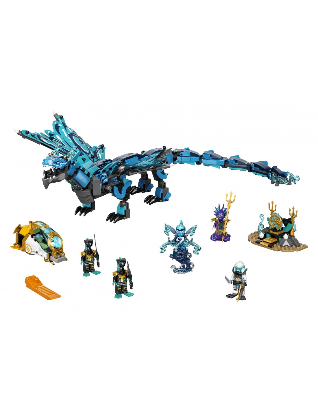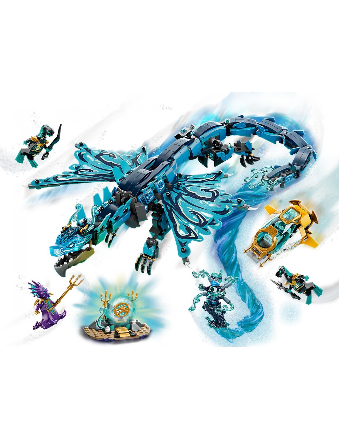 - В наборе «Водный дракон» LEGO NINJAGO (71754) вы найдёте подвижного дракона, с которым поклонники ниндзя смогут воссоздать приключения из сериала «НИНДЗЯГО: Тайна глубин» и много часов провести за увлекательной игрой.