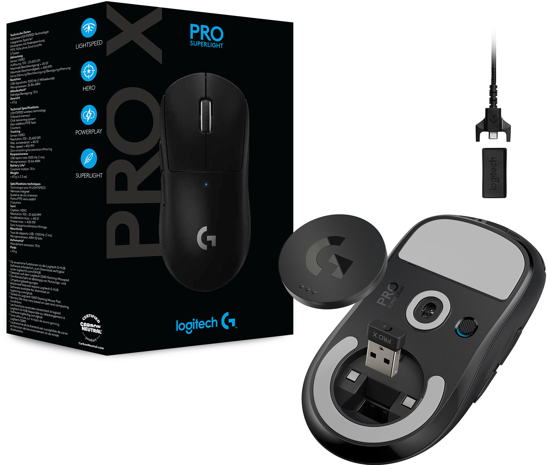 Logitech Gaming PRO X SUPERLIGHT Wireless - HERO 25K, 5 buttons, LIGHTSPEED wireless receiver, POWERPLAY compatible, Onboard memory, Click tensioning system, BATTERY LIFE 70h