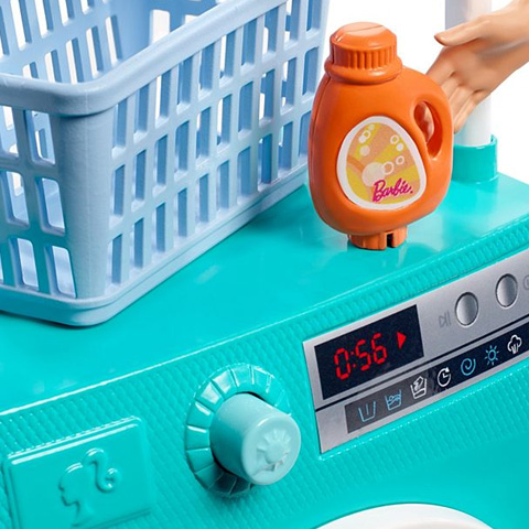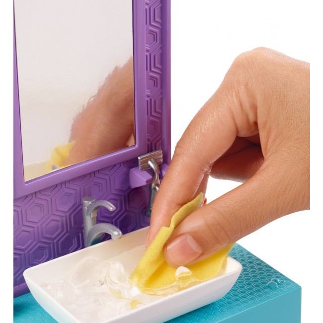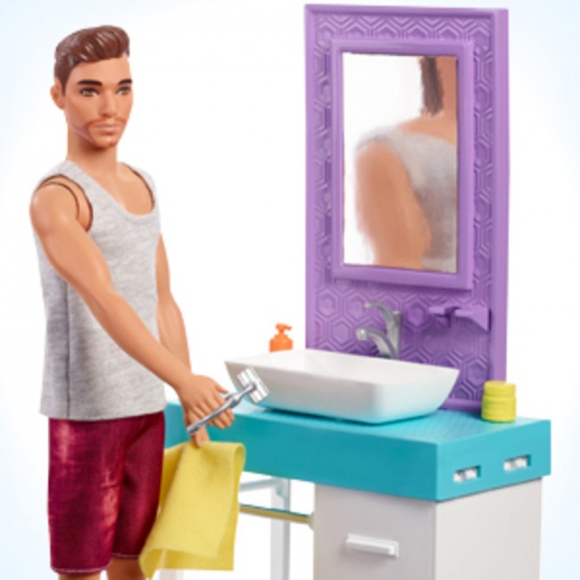 В комплекте представлена ??кукла Кен, умывальник, зеркало, тумбочка, полотенце и прочие аксессуары.