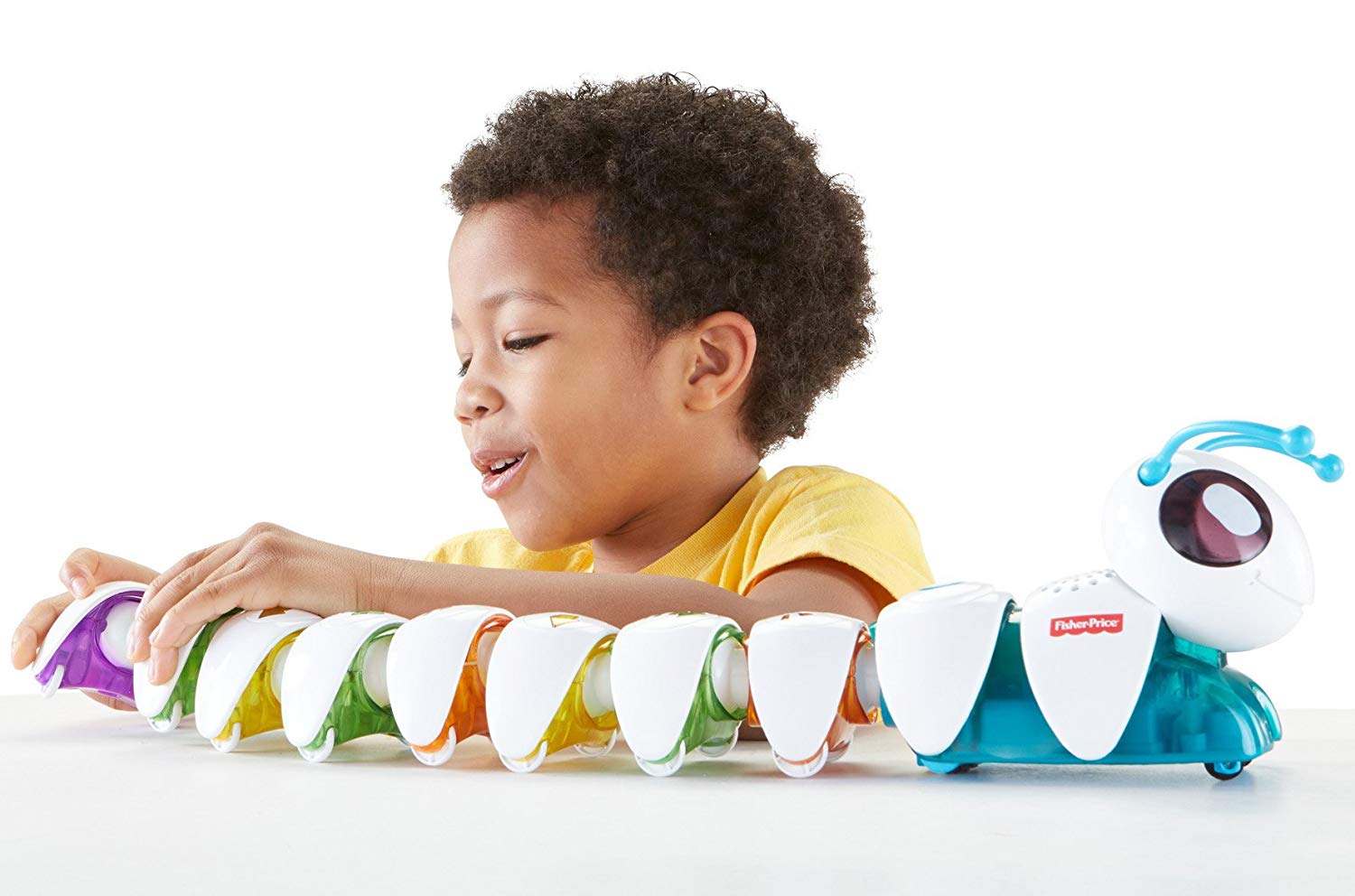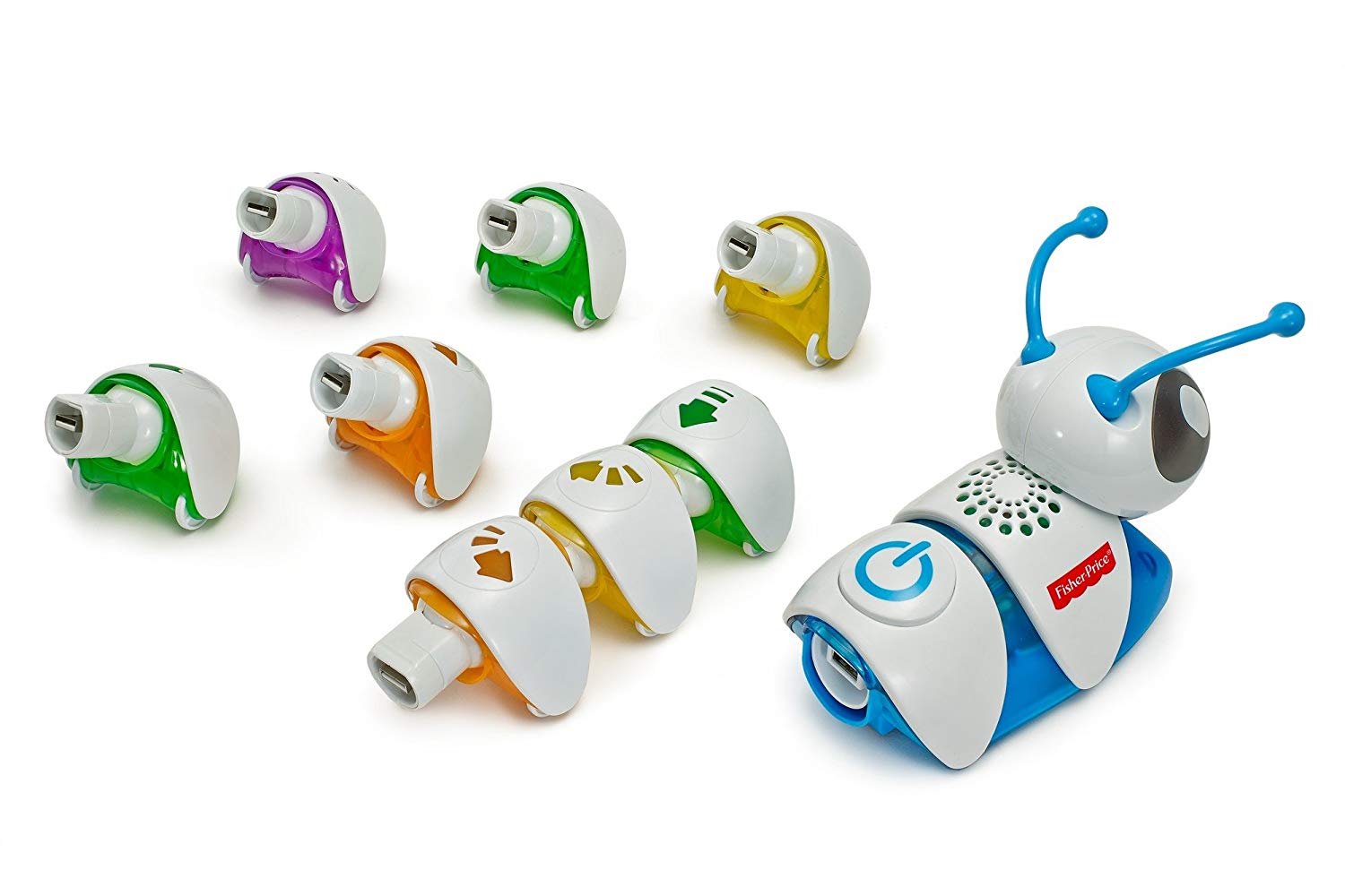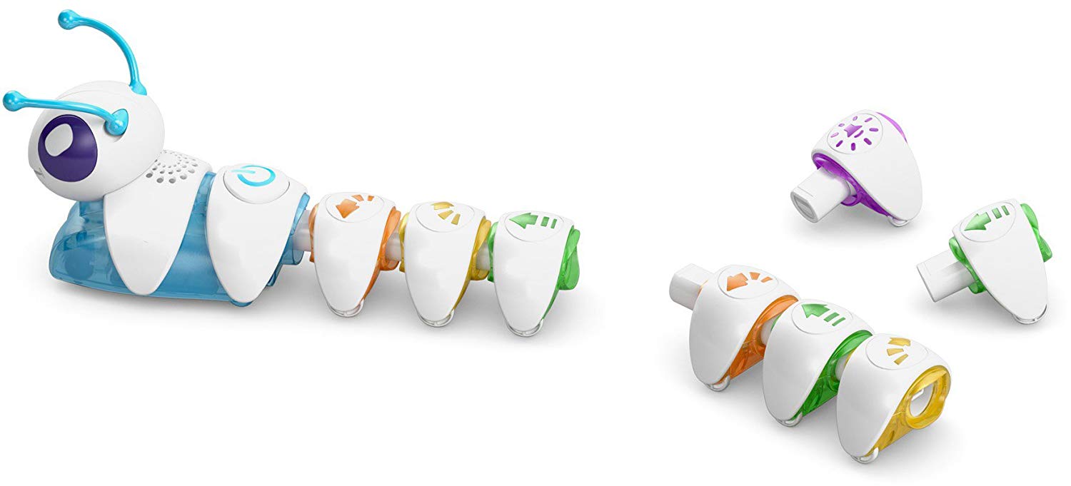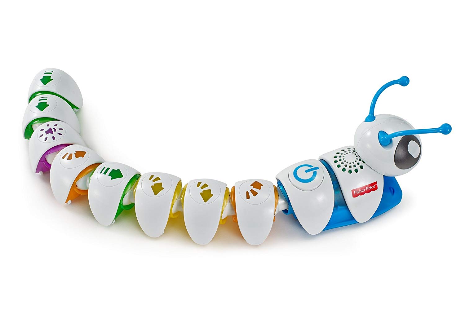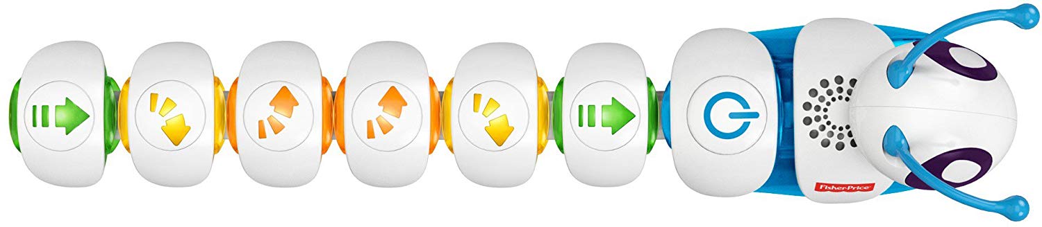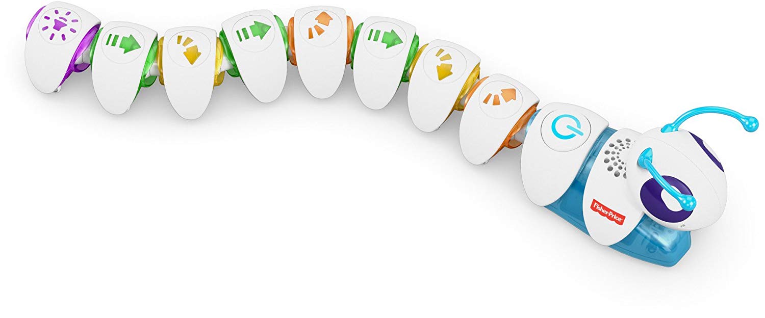 Интерактивная гусеница «Соединяй и запускай» (DKT39 Fisher-Price) – очень неординарная и интересная игрушка. Сама гусеничка состоит из головы и раздельных сегментов туловища, каждый из которых обозначен различными стрелочками. В зависимости от того, в какой последовательности сложить туловище, так гусеница и поползет. Такая игрушка способствует не только развитию моторики и координации движения, но и развитию мышления и памяти.