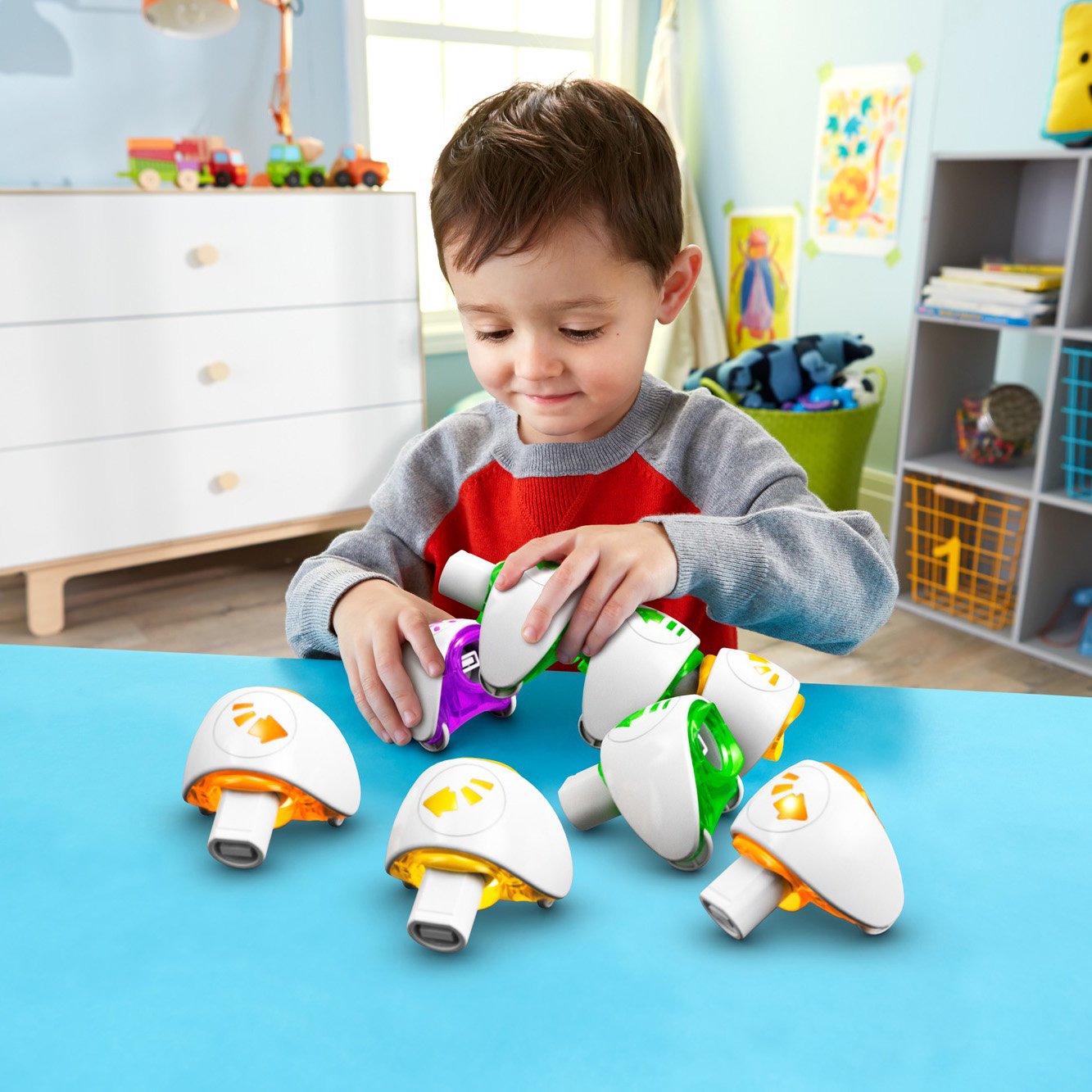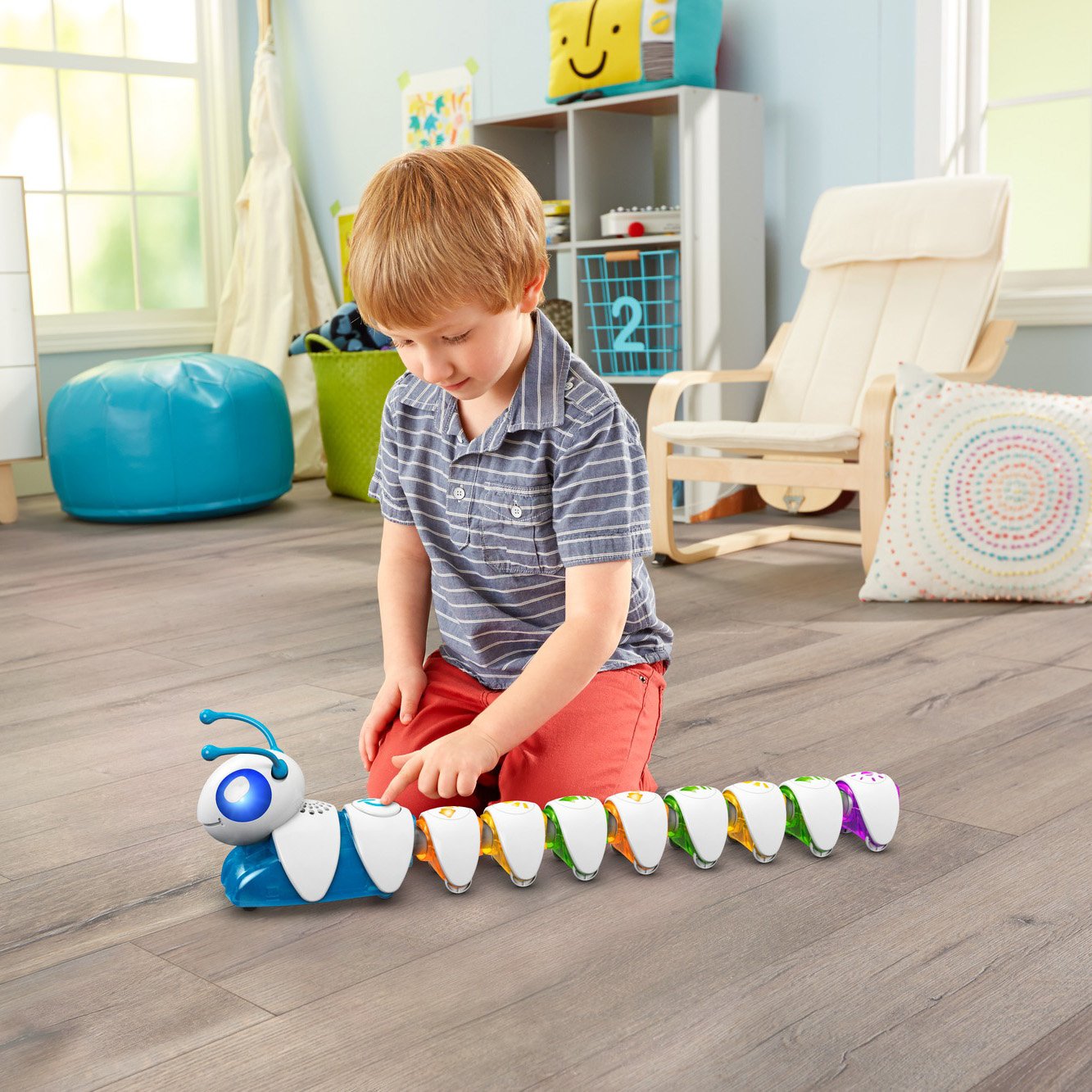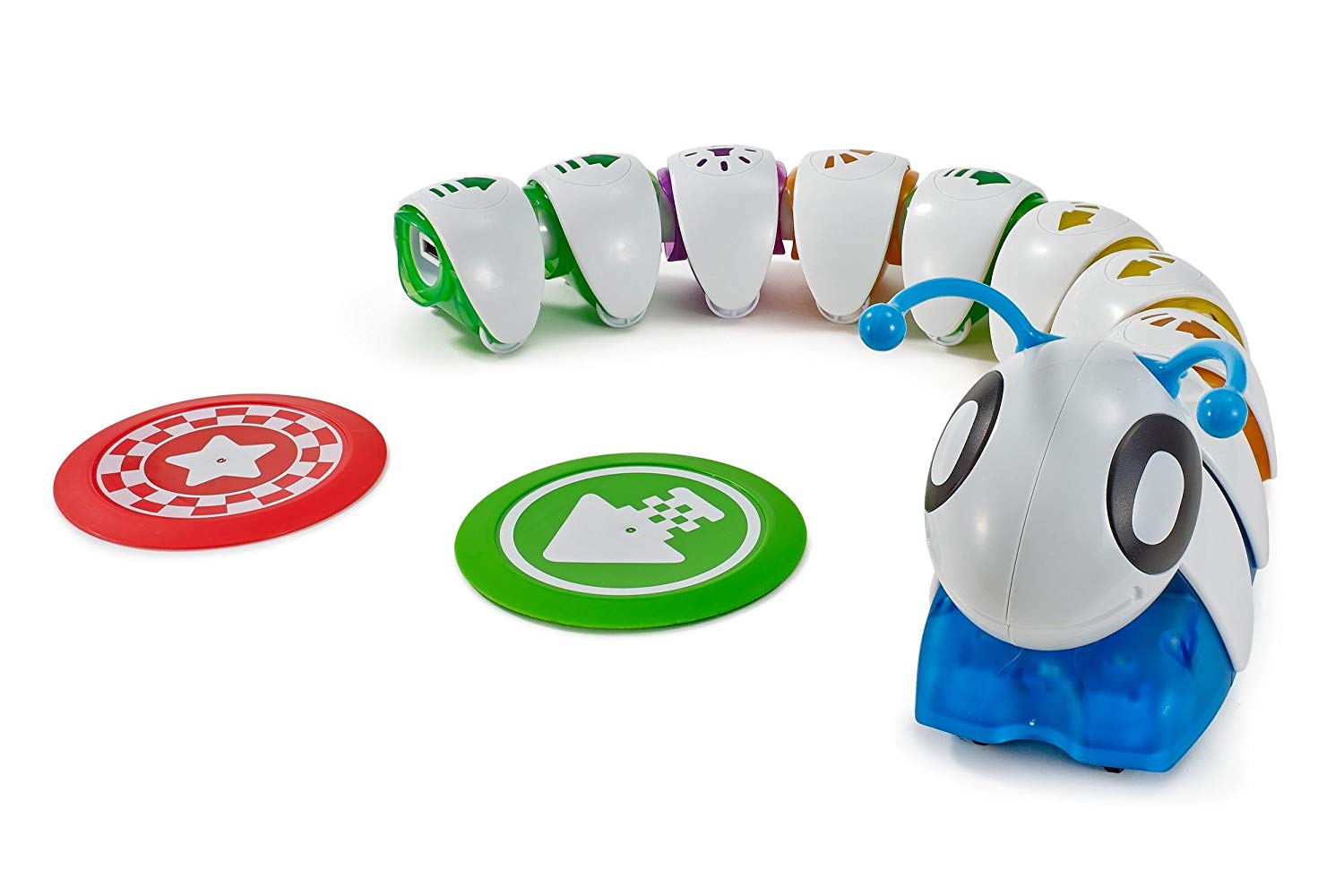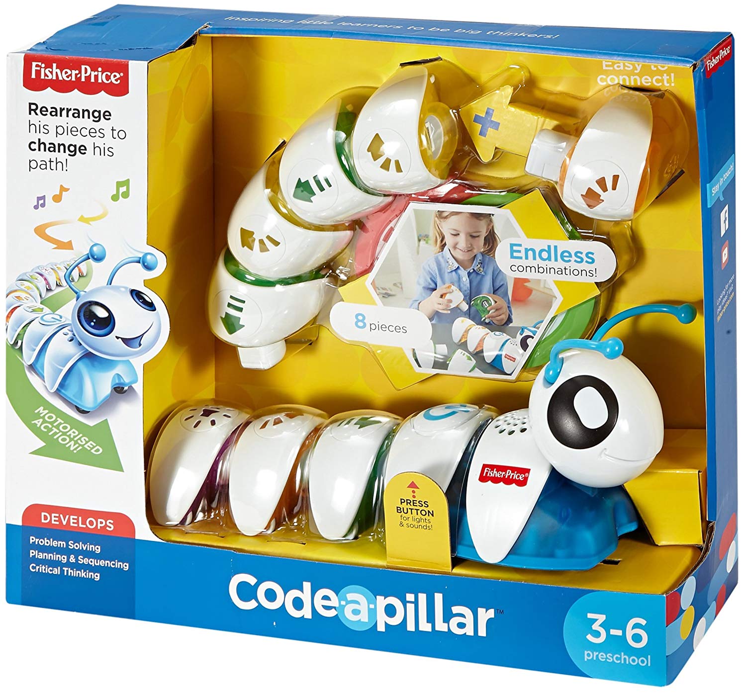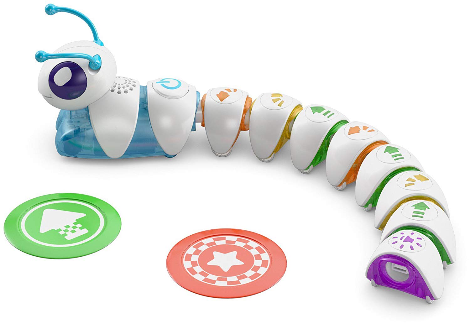 Интерактивная гусеница «Соединяй и запускай» (DKT39 Fisher-Price) – очень неординарная и интересная игрушка. Сама гусеничка состоит из головы и раздельных сегментов туловища, каждый из которых обозначен различными стрелочками. В зависимости от того, в какой последовательности сложить туловище, так гусеница и поползет. Такая игрушка способствует не только развитию моторики и координации движения, но и развитию мышления и памяти.