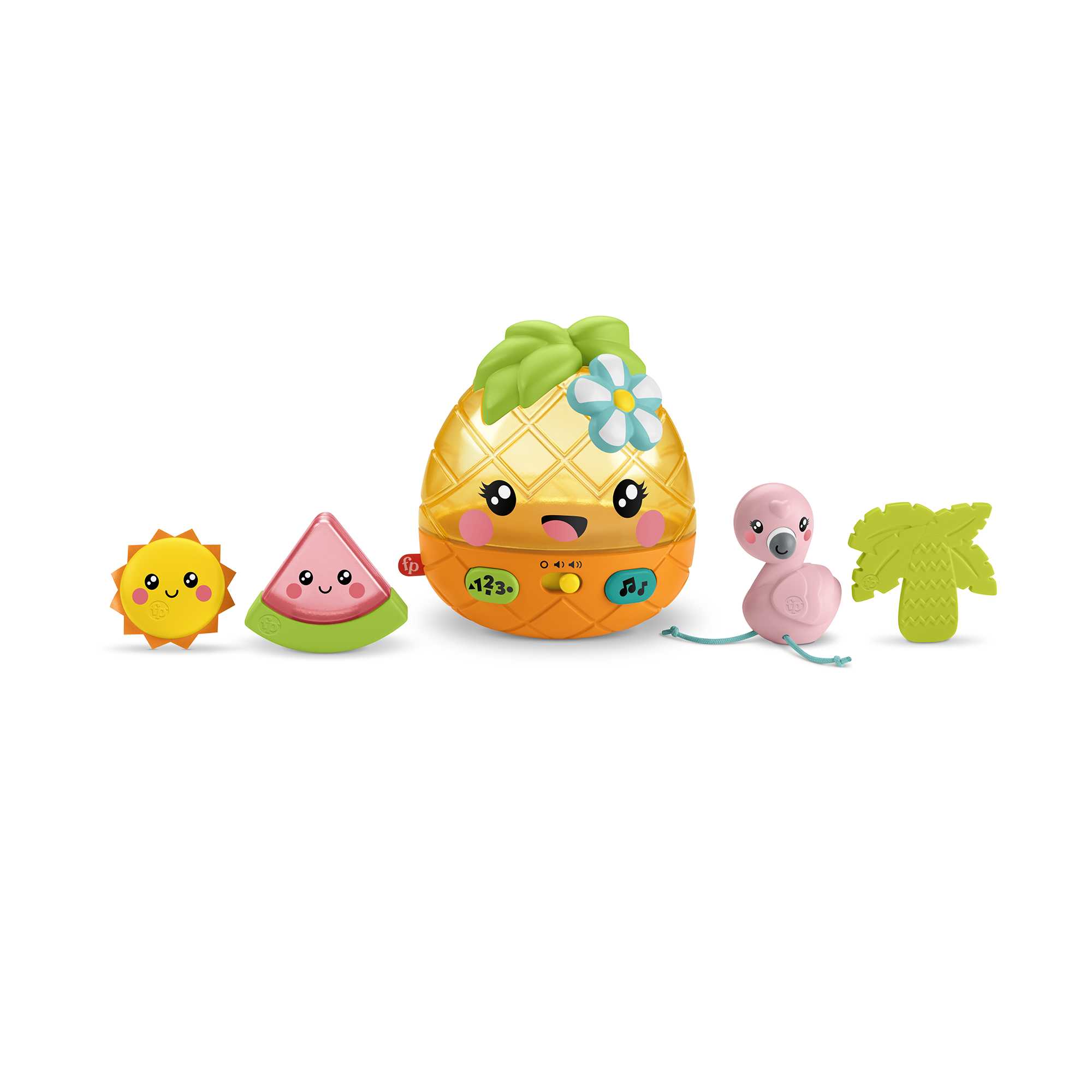 - В комплекте: ананас, который воспроизводит 35 звуков, мелодий и фраз на английском языке; кусочек арбуза; солнышко; фламинго; пальма; 3 батарейки типа АА.