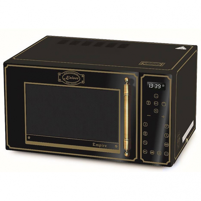 Mикроволновая печь Kaiser M 2300 EM — многофункциональная модель, выполненная в черном цвете с элементами цвета «бронза». Режим «Гриль» поможет подрумянить мясо до хрустящей корочки. Электронный таймер позволяет запрограммировать время работы и частоту волн. Внутреннее покрытие из нержавеющей стали сделает уход простым. Ключевые преимущества: Режим «Гриль» Стильный ретро-дизайн Внутреннее покрытие из нержавеющей стали ОБЩИЕ ХАРАКТЕРИСТИКИ: Тип: отдельностоящая Высота: 28,5 см Ширина: 48,3 см Глубина: 37 см ДИЗАЙН И КОНСТРУКЦИЯ: Коллекция: Retro Цвет: черный Цвет фурнитуры: бронза Материал рабочей камеры: нержавеющая сталь Открывание: ручка УПРАВЛЕНИЕ: Таймер: есть Дисплей: цифровой Управление: электронное ФУНКЦИОНАЛ: Количество уровней микроволн: 5 Уровни мощности микроволн: 160 / 320 / 480 / 640 / 900 Гриль кварцевый Размораживание: есть Приготовление по времени и массе: есть Память настроек: есть СПЕЦИАЛЬНЫЕ РЕЖИМЫ: Мясо: есть Птица: есть Детское питание: есть КОМПЛЕКТАЦИЯ: Вращающееся стеклянное блюдо: есть Диаметр поворотной тарелки: 27 см Хромированная многофункциональная решетка: есть ТЕХНИЧЕСКИЕ ХАРАКТЕРИСТИКИ: Внутренний объем: 23 л Мощность СВЧ: 900 Вт Мощность гриля: 1300 Вт Напряжение: 220-240 В Частота: 50 Гц