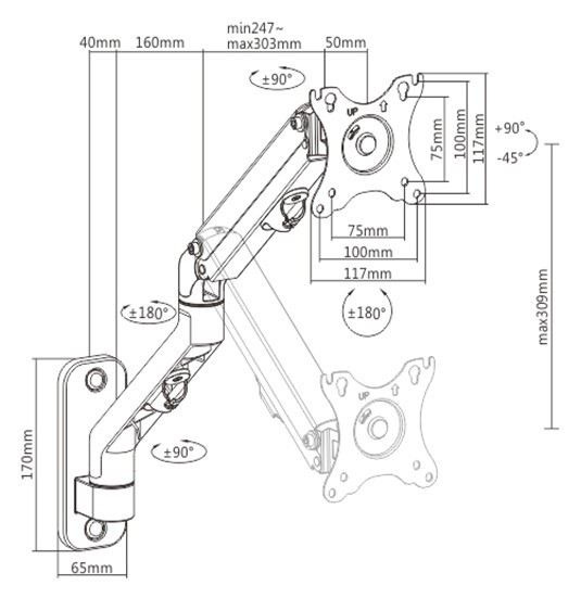 Monitor wall mount arm for 1 monitor up to 27” Gembird MA-WA1-02, Adjustable wall display mounting arm (rotate, tilt, swivel), VESA 75/100, up to 9 kg, black