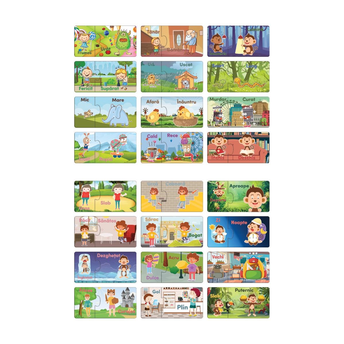 Набор содержит 48 деталей, которые соответствуют двум, поэтому: на обеих частях есть похожие иллюстрации, но которые показывают противоположные состояния, атрибуты или понятия.