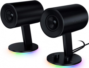Колонки игровые Razer Nommo ChromaПОЛНОЕ ПОГРУЖЕНИЕПогружение в игровую среду требует наличие звукового и зрительного компонентов, которые бы работали вместе, стирая грань между фантазией и реальностью. И Razer Nommo Chroma обеспечивает именно такой эффект. Благодаря мощному звучанию, пространственной точности звука и световым эффектам они позволяют вашим играм ожить и выйти за пределы экранаДИНАМИКИ ИЗ ПЛЕТЕНОГО СТЕКЛОВОЛОКНА С ПОКРЫТИЕМ KEVLAR®Динамики Razer Nommo Chroma диаметром 3" с покрытием Kevlar® разработаны для обеспечения сверхчистого звука с поражающей четкостью. Включение материала Kevlar® в конусы излучателей помогает снизить вибрации и обеспечивает воспроизведение более «плотного» звука с более качественной частотной характеристикой, позволяя услышать индивидуальные компоненты звуковой картины и новые детали звука.ЗАДНИЕ ФАЗОИНВЕРТОРЫСзади на корпусе колонок Razer Nommo скрываются задние фазоинверторы. Каждый из них предназначен для усиления воспроизведения низких частот и получения более насыщенного и богатого спектра звучания. Фазоинверторы находятся внутри крупных резонаторов, усиливая низкочастотные компоненты, которые проберут вас до самых пяток, будь то выстрел, правый хук или EDM-композиция.СПЕЦИАЛЬНЫЙ РЕГУЛЯТОР УСИЛЕНИЯ БАСАНа правом динамике расположен регулятор управления басами, который позволит вам идеально настроить звучание от сотрясающего баса до приглушенного гула для позднего времени суток. Благодаря автоматической регулировке усиления вы можете быть уверены, что низкие частоты ваших композиций не искажаются.