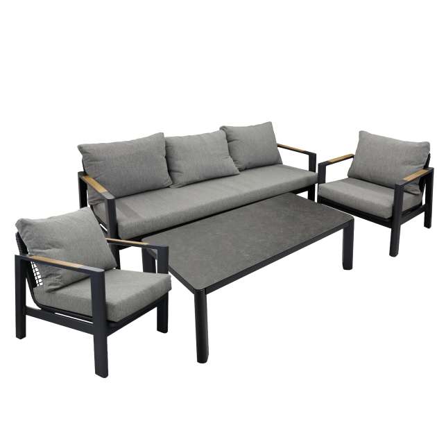 Șezut/Spătar: Aluminiu vopsit, decorate cu împletitură din fibre sintetice de polipropilenă, imitând ratanul natural