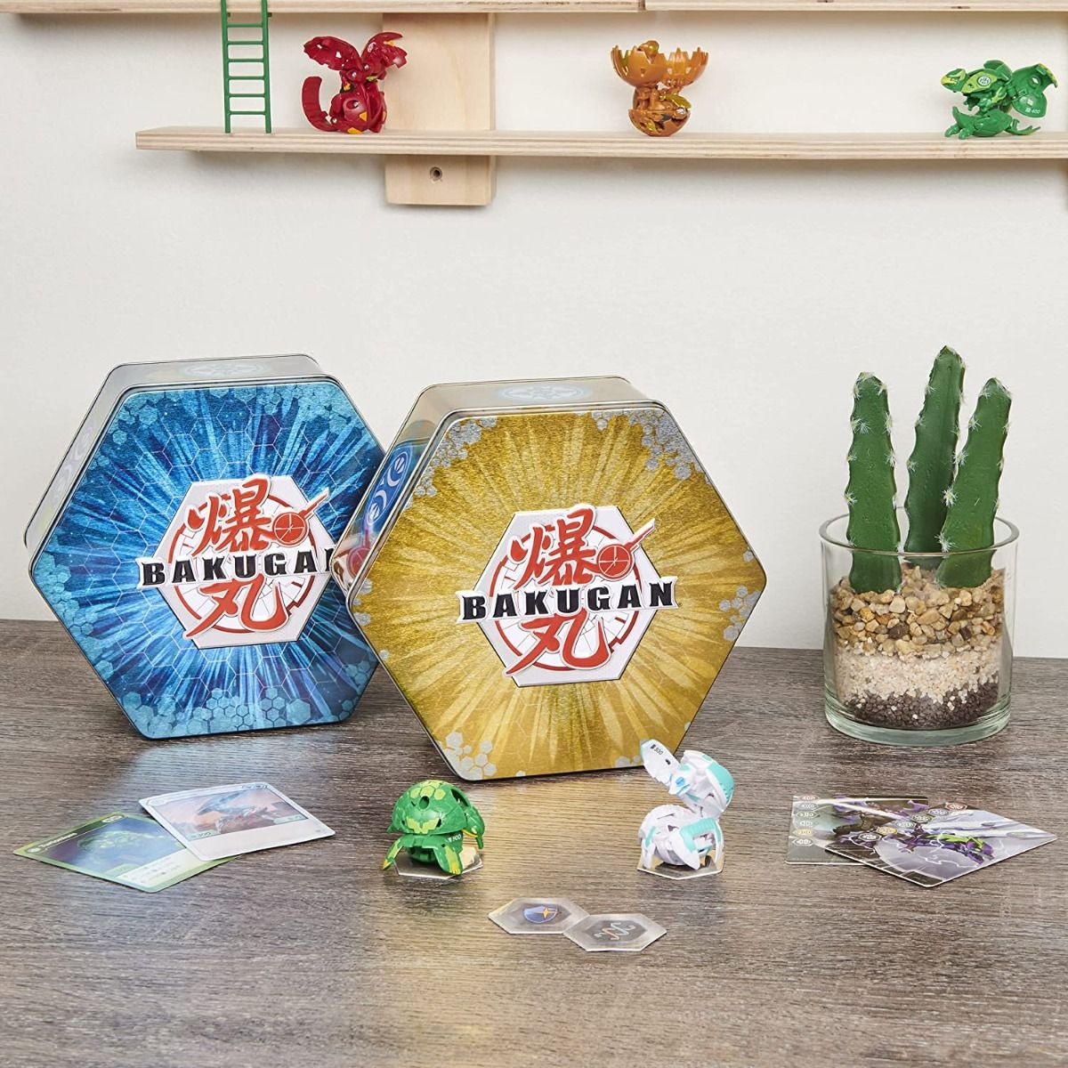 - Имея 2 слоя для хранения, Baku-Tin может вместить до 6 бакуганов из вашей коллекции, 2 колоды по 40 карт и 12 бакуганов!
