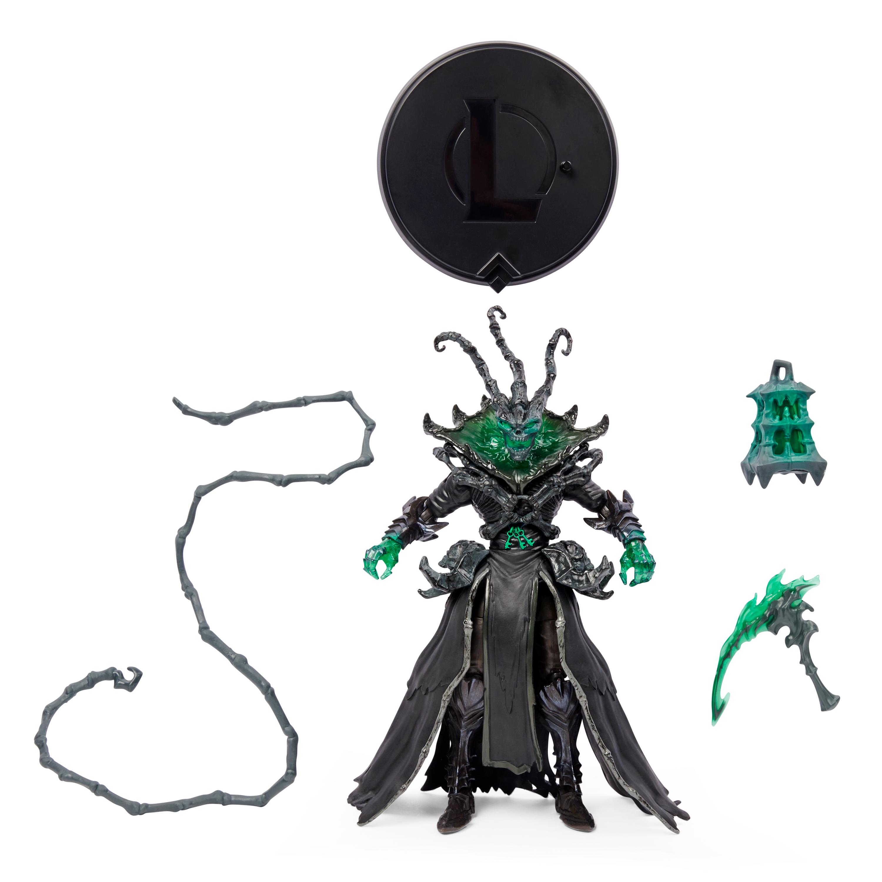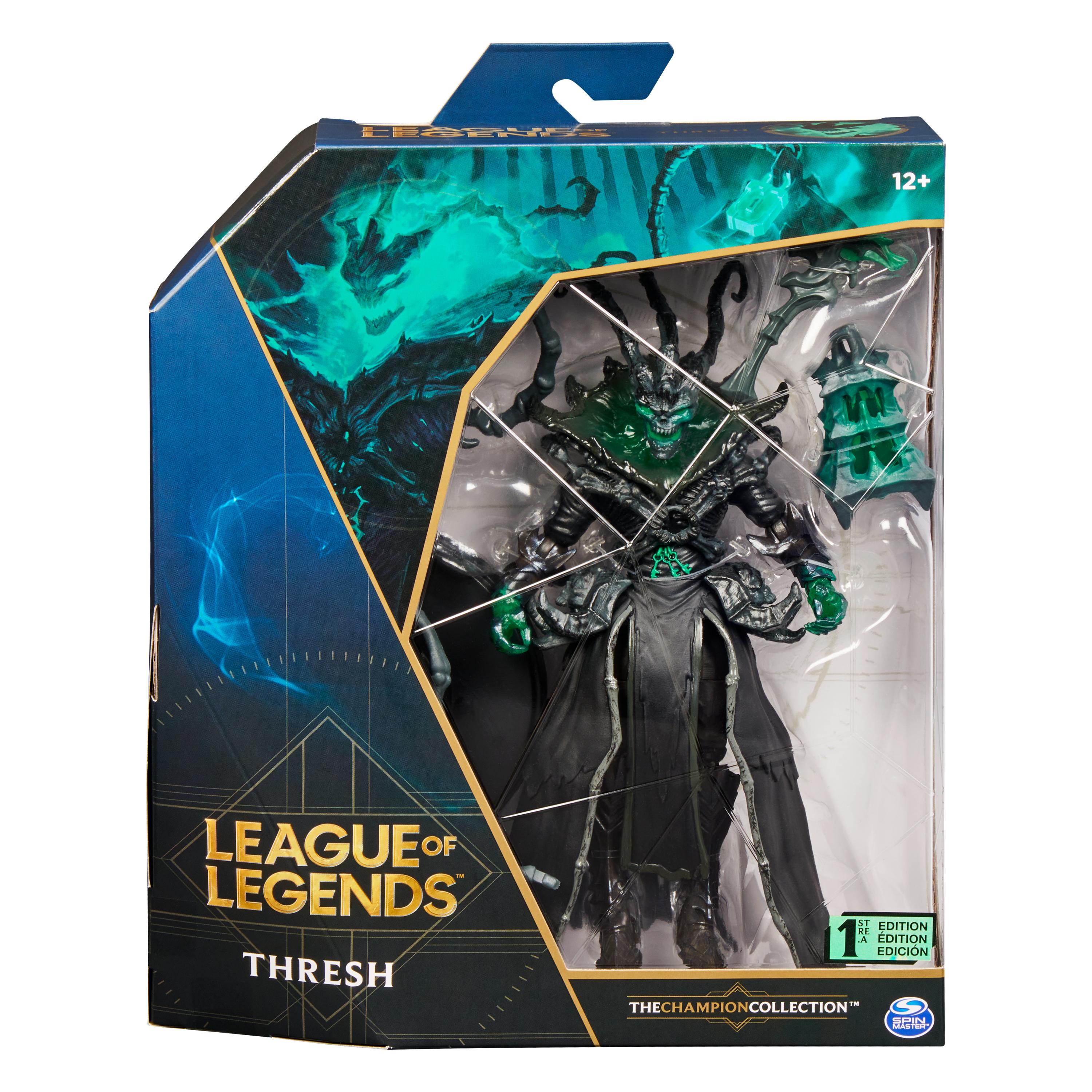 - 2 ЭПИЧЕСКИХ АКСЕССУАРА: включает в себя 2 аксессуара премиум-класса, вдохновленных игрой, и тематическую подставку для фигурки. Thresh поставляется с высококачественными аксессуарами Lantern и Scythe.
