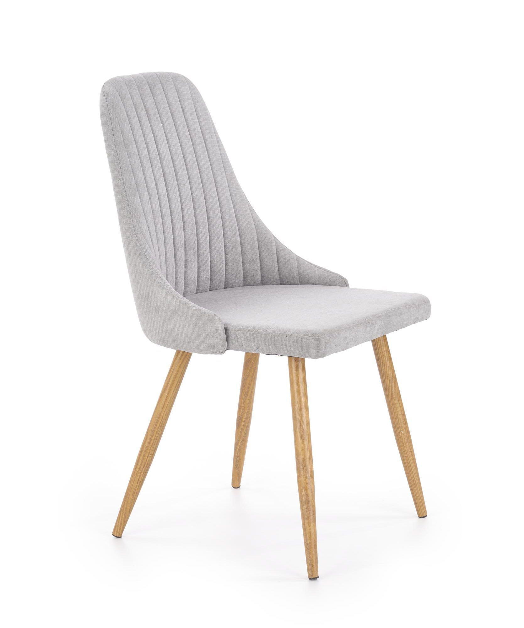 Cтул K-285Ножки выполнены из окрашенной под цвета дерева стали. В качестве обивки использована ткань светло-серого цвета. Декоративные стежки на спинке в форме полос придают уникальности данной модели.Ширина 56 смВысота сиденья 50 смВысота 91 смГлубина 49 см