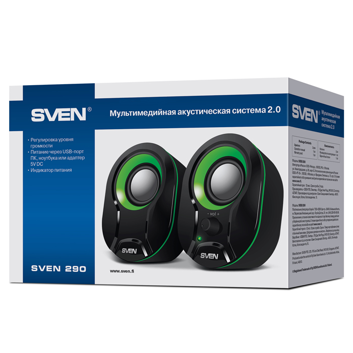 SVEN 290 Black-Green (USB), 2.0 / 2x2,5W RMS, Power LED, USB power