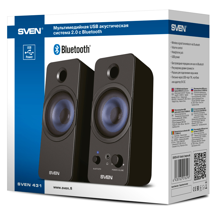 SVEN 431 Black (USB), 2.0 / 2x3W RMS, Bluetooth, USB or 5V DC power supply,