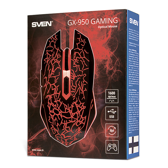SVEN GX-950 Gaming, Optical Mouse, 600/1000/1400/1600 dpi, 5+1