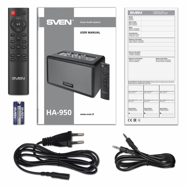 SVEN HA-950, Bluetooth Home Audio Systyem 60W (RMS), TWS, USB, microSD, Remote control, MDF, Soft eco-leather, Volume and tone rotary knobs on the top panel, AUX input, Black