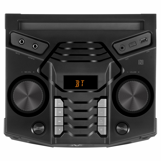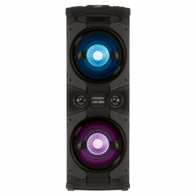 SVEN PS-1500, 500W (2x250) Dynamic switchable RGB backlight, TWS, Bluetooth, FM, USB, LED display, microphone input for karaoke, NFC, Audio input for connecting an electric guitar, Carrying handle and wheels, Wooden body (MDF), 13 kg, Black
