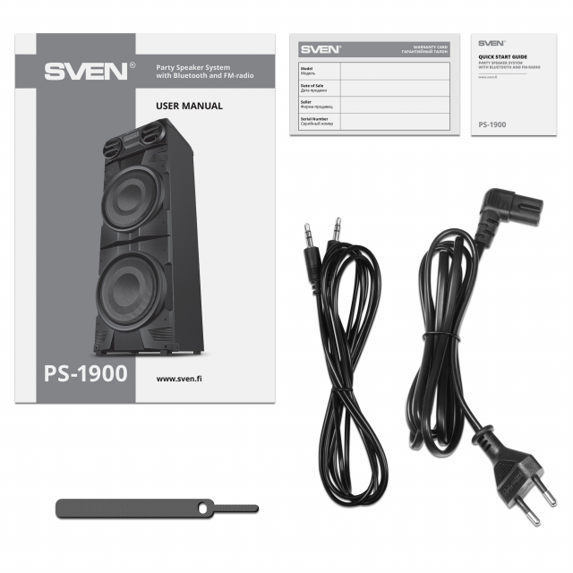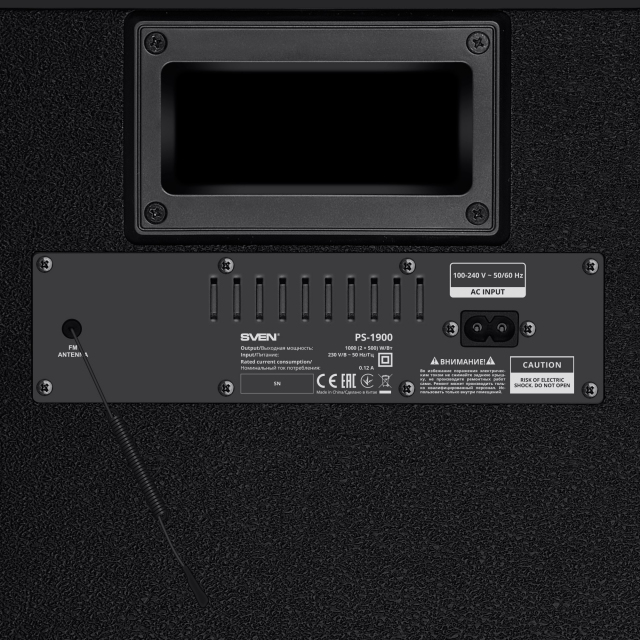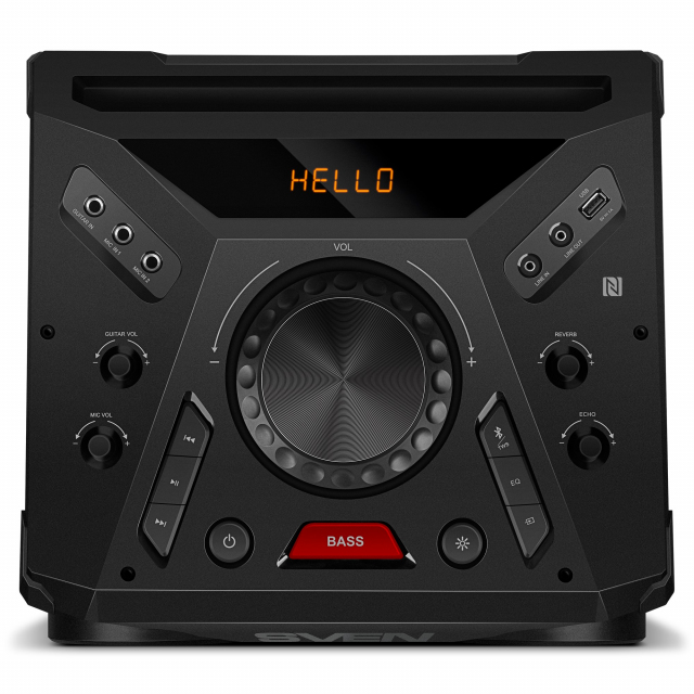 SVEN PS-1900, 1000W (2x500) Dynamic switchable RGB backlight, TWS, Bluetooth, FM, USB, LED display, 2 microphone inputs for karaoke, NFC, Audio input for connecting an electric guitar, Carrying handle and wheels, Wooden body (MDF), 17.2 kg, Black