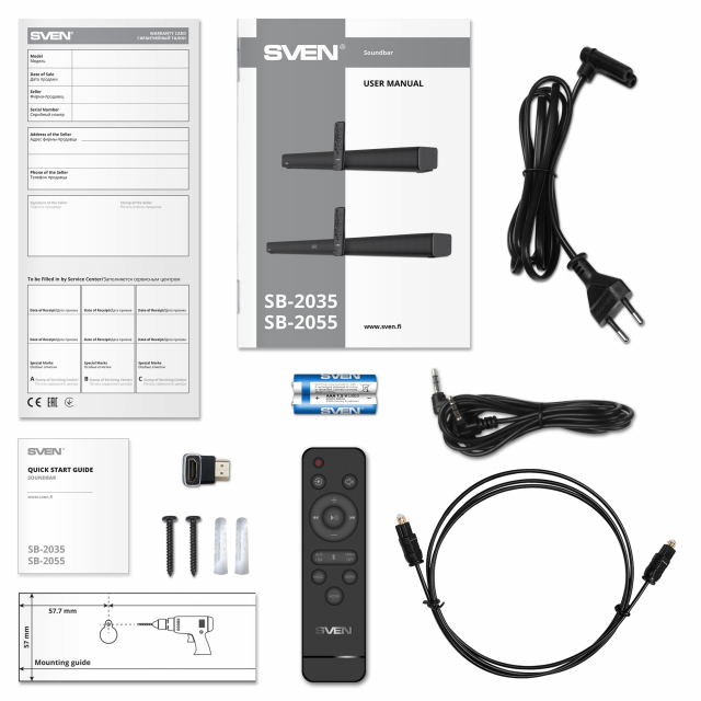 SVEN Soundbar SB-2035, 40 W, Bluetooth, AUX (3.5mm jack), HDMI (ARC), SPDIF (Optical), remote control, black