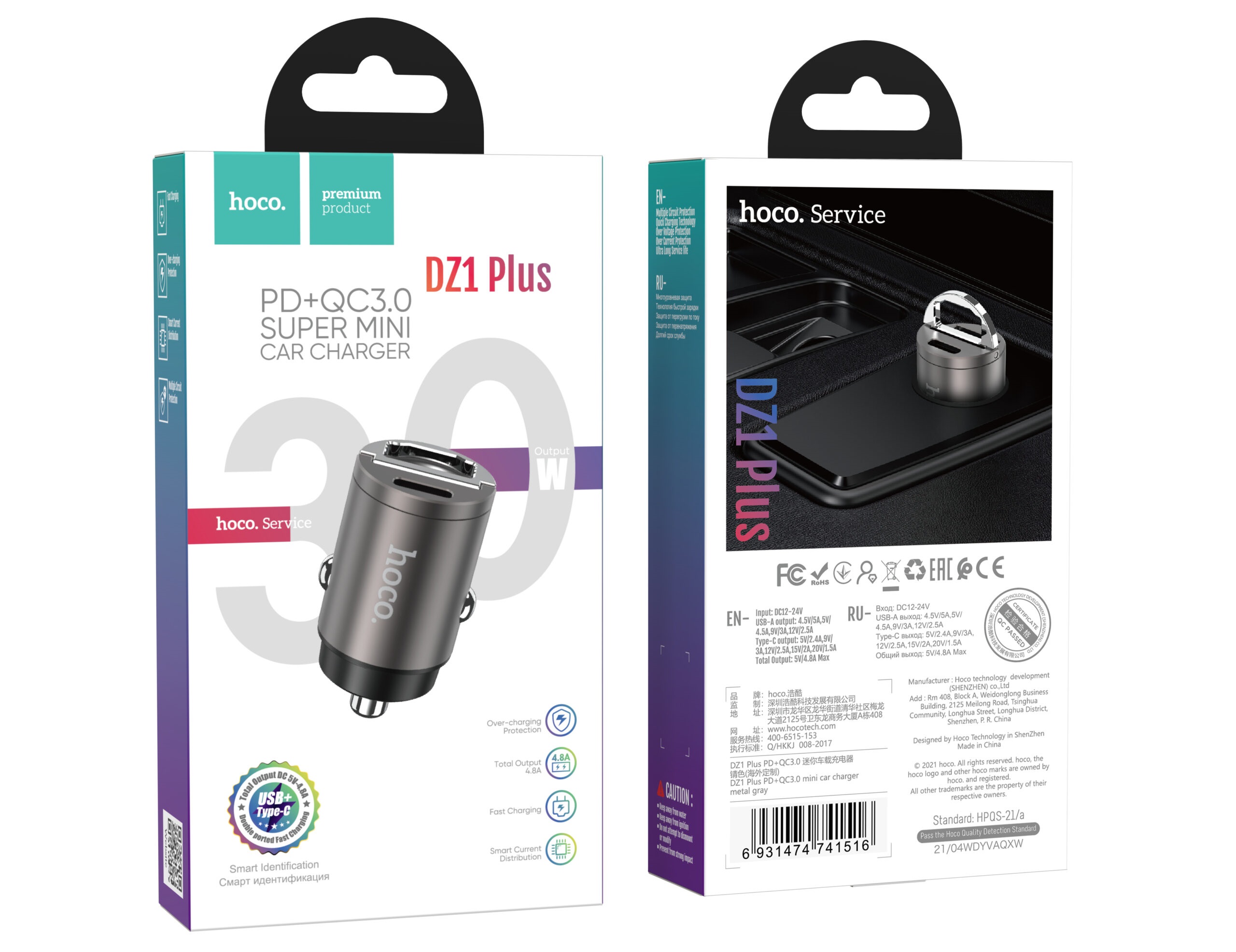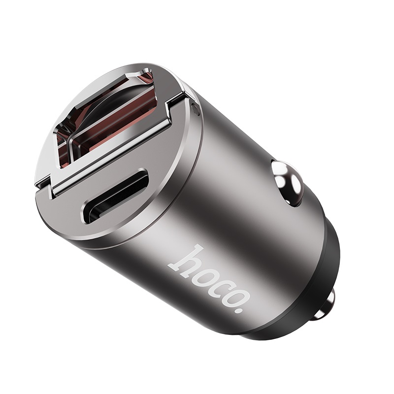 USB автомобильное зарядное устройство HOCO DZ1 PLUS / 2 x USB charger, Total output: 5V/4.8A / up to PD3.0 / QC3.0 / Super mini car charger / Silver