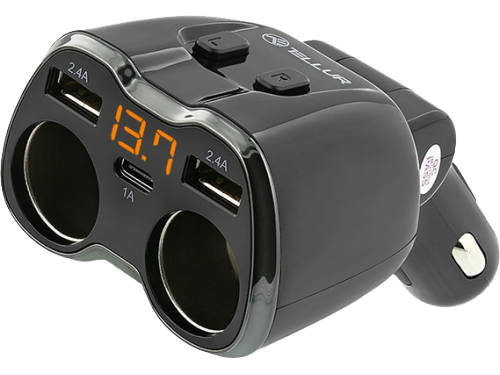 USB Car Charger - Tellur, 2xDC 12-24V, 2xUSB QC 2.4 + 2.4A, Type-C 1.5A, Lighting 1A, LED display, On/Off switch button, Black TLL321031