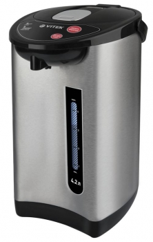 Термопот VITEK VT-7101 – это стильный кухонный аксессуар в корпусе из нержавеющей стали объемом 4,2 л. Простая и понятная панель управления, расположенная на крышке, делает процесс пользования прибором максимально удобным. С термопотом вы можете не только кипятить воду, но и сохранять ее горячей в течение нескольких часов за счет режима поддержания температуры. Для повторного кипячения воспользуйтесь соответствующей функцией, просто нажав на нужную кнопку. Вода в термопоте подается двумя способами: автоматически или нажатием чашкой на клапан. Модель VT-7101 оснащена удобной ручкой, с помощью которой термопот легко переносить.